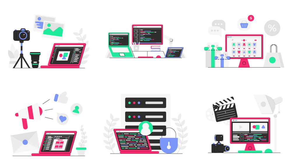 - Set of 20 workspace and desk-related illustrations.